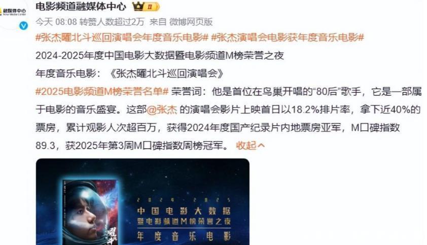 这两年因着娜姐出现变少,而杰哥也越来越受欢迎,已经很少会有“唱衰”他们的声音了。而前不久杰哥也是迎来了好消息,那就是杰哥的演唱会纪录片,获得了一个音乐方面的奖项。
